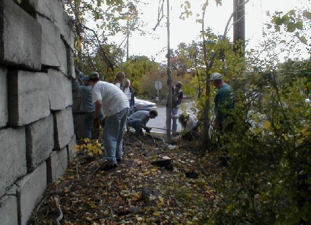 | May 12th, 2001: With loppers and shears, CRT volunteers remove a decade of brush and greenbriar to reveal the trail. |