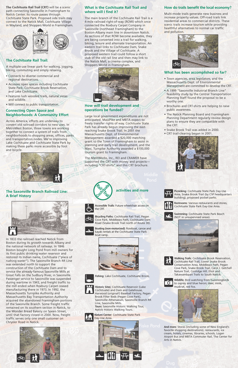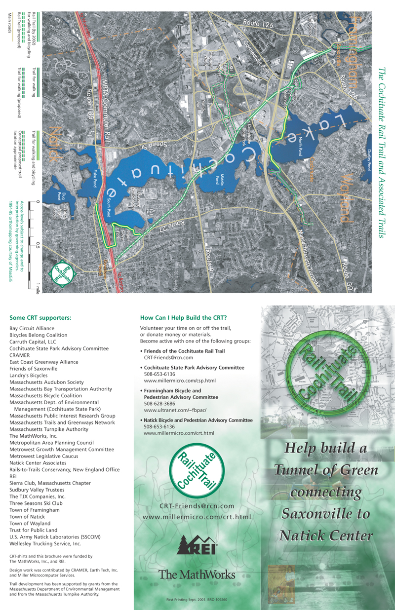 To celebrate the opening of a first section of the Cochituate Rail Trail and to increase public awareness, "CRT-shirts" were donated by The MathWorks, Inc. of Natick. They are on sale for $10 each (to benefit CRT projects) at REI in Framingham. A new CRT brochure also was designed and became available in December 2001. (Brochure printing is made possible by a gift from REI. Text is by A. Richard Miller. The CRT logo and CRT brochure design are volunteer contributions of commercial artist Steve Broadley, and the map editing is by Tom Branham.)