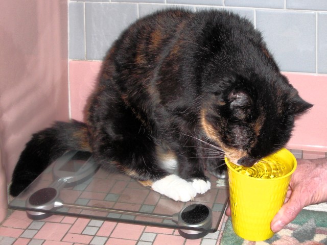 Morgan the Wonder Cat can keep time. She expects to eat at 11AM and 11PM, and she reminds us about five minutes before. For breakfast, she lets Jill brush her teeth before eating; she sits alongside at just the right angle to help. See Morgan get her teeth brushed (2.2MB AVI video file). At Morgan's evening meal, we have a different ritual. She waits for Dick to say the magic words: "Yes, now!" Then she races downstairs to the kitchen while Dick runs behind, stomping some and clapping his knees. Morgan points at the food bowl, steady on like a hound dog, until Dick picks her up and scratches her under the chin and belly. Morgan supervises as Dick puts food into her bowl, and when he holds it over her she comes over and faces him. She obeys "Sit", "Shake hands" (right hand only, of course), and gathers a "Good Cat!" and a head rub for her efforts. Then she heads over to the floor mat where Dick places the food bowl with another, "Yes, now! Good Cat." See Morgan shake her stuff (3.4MB AVI video file).